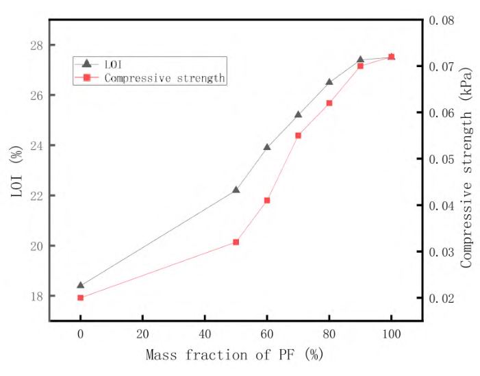 由圖2可知,PF的添加量由0wt%增加至100wt%時,EPS/PF復(fù)合材料的抗壓強度增大。隨著PF添加量的增多,EPS/PF復(fù)合材料極限氧指數(shù)增大,阻燃性能得到提高。當(dāng)PF的添加量由0wt%增加至90wt%時,阻燃性能增長迅速;當(dāng)PF的添加量由90wt%增加至100wt%時,阻燃性能增長緩慢。因此,確定PF的添加量為90wt%,EPS/PF復(fù)合材料的阻燃性能及力學(xué)性能相對較好。數(shù)據(jù)表明,用PF包覆在EPS顆粒外層,能提高材料的阻燃性能。這是因為在高溫下,EPS顆粒表面的PF交聯(lián)固化,形成高碳泡沫結(jié)構(gòu),成為***的熱絕緣體,從而提高材料的阻燃性能,同時降低EPS材料燃燒放出的有毒氣體。